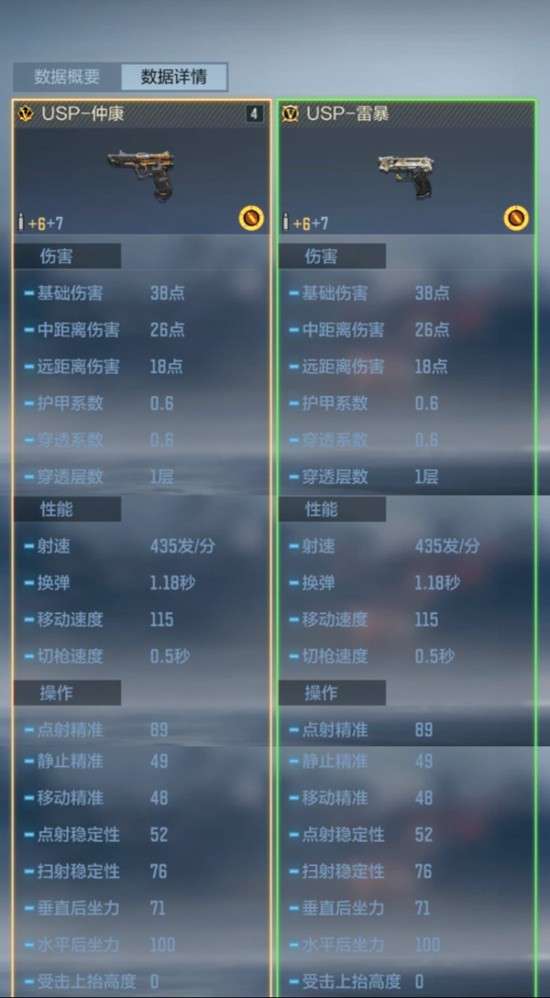 这里我们以最经典的USP-雷暴与之进行对比,可以看到二者在数据面板上完全一致,而USP-雷暴作为职业选手的指定副武器和巅峰赛的禁用替换武器,其强度已经得到了时间的证明,并且USP-仲康与其不分伯仲,完全可以弥补许多没有USP-雷暴的玩家的遗憾了。
