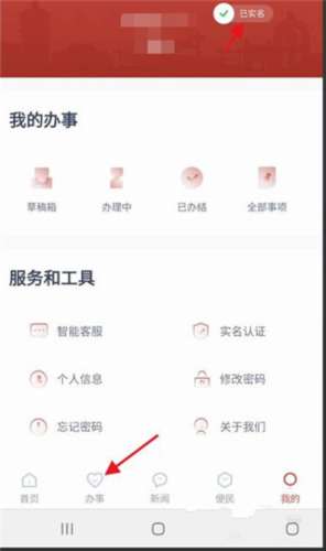 3、实名认证完毕后回到首页,查看上方是否显示已实名后,点击下方的办事进入;