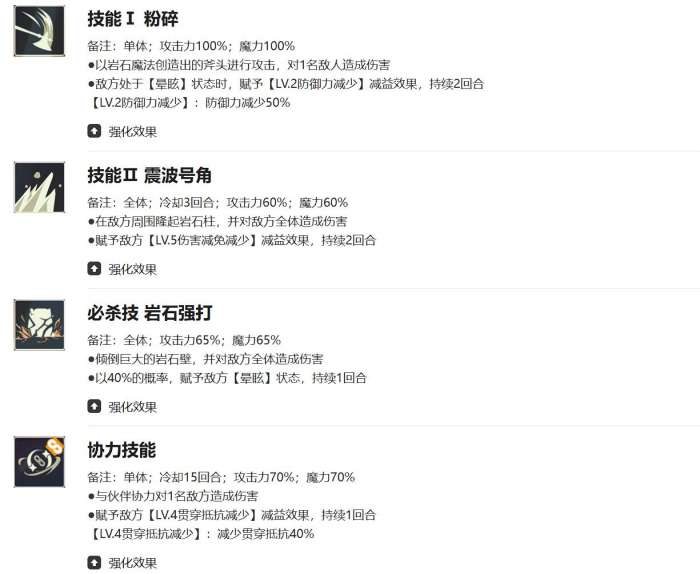 核心技能粉碎对单体造成100%伤害,敌方晕眩时附加50%防御减少,震波号角全体60%伤害,附加伤害减免减少。岩石强打全体65%伤害,40%概率晕眩。觉醒被动攻击防卫者类型敌人伤害+5%,专属被动无特殊效果,所以说他的后期能力就相当于收了一个被动,上限不如其他SR。技能设计主要就是围绕debuff+控制,但触发条件也是比较难的,实战中难以稳定生效,强化效果提升有限。