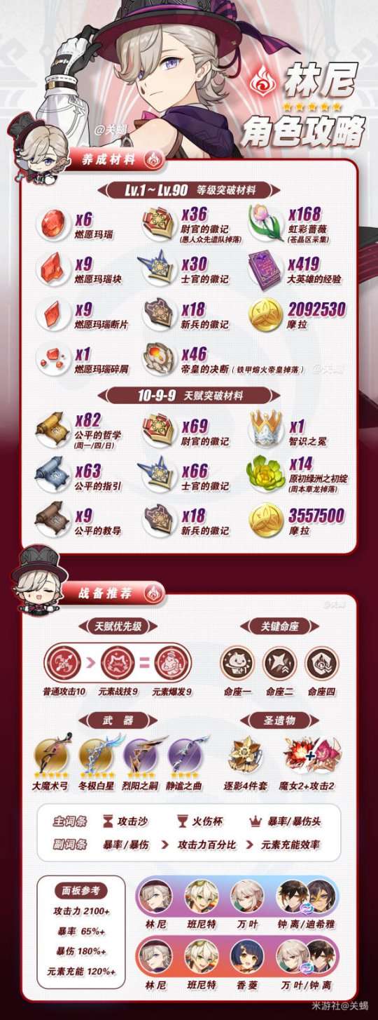 林尼的核心打法是重击,因此普通攻击需要优先拉满。施放二段蓄力箭「隐具魔术箭」会在目标落点生成一只猫猫帽,对接触到的单体敌人造成一次火元素伤害,同时获得一层「隐具余数」。每叠满5层「隐具余数」,就可以提高引爆伤害(最高叠到5层)。只要林尼生命值高于60%,每发一次「隐具魔术箭」都会扣除最大生命值的20%。元素战技提供引爆伤害(范围伤害+重击倍率)和治疗能力,叠的层数越高,达到的伤害和治疗就越高(每层恢复20%生命值)。此外,元素战技还具备不错的收尾能力,可次选拉满。当施放元素爆发后,林尼会化身为一只可控制的帽帽猫,期间存在3秒。对沿途每名敌人造成1次火元素伤害,并获得一层「隐具余数」。需要注意的是,只能按下元素战技E来提前解除形态,其他操作无法解除。