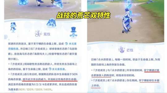 战技“孤心沙龙”有两种属性,分别是“荒”和“芒”。使用属性“荒”时,会召唤出3名沙龙成员,他们会优先攻击正在我方进攻的目标。使用属性“芒”时,会召唤众水的歌者,这些歌者会间歇性地为场上的角色恢复生命值。
