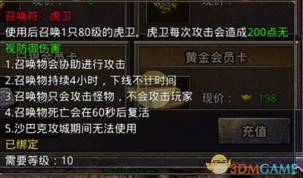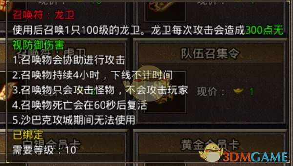 第三种,龙卫,需要等级10级才能召唤,固定伤害为300点,可用18元宝购买,黄金会员每天可以通过领取工资的形式来获取一张龙卫召唤符。