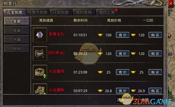 2、通关拍卖行购买装备,玩家可以用元宝和传奇币来购买自己喜欢的装备,同时也可以出售自己不需要的装备
