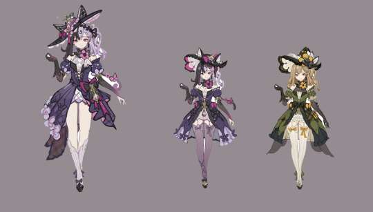 然后再说说另外一个少女体形的调香师稿子。同样是以花朵为主题的裙子,原本的丝袜延续了下来,甚至还有进阶版本。通过调色,整体颜色比较偏深色系,与上个版本形成鲜明的对比。帽子部分多了类似猫咪耳朵的装饰,身上还有很多蝴蝶结元素,看起来非常可爱。