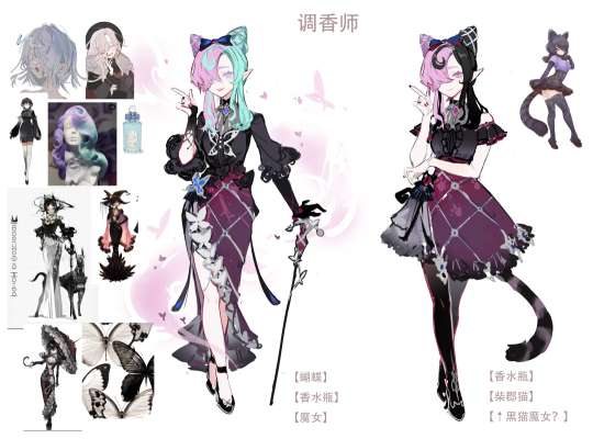 最后再来看一下个人觉得比较接近调香师的版本,该草稿把上面的素有元素都融合到了一起。考虑到是成女角色,裙子部分设计成长款要更加优雅。猫咪元素被安排在了发型上面,蝴蝶结保留下来,其余的装饰品也变成了蝴蝶。通过文字描述,香水瓶的确是该角色的必备物品,也有可能成为其攻击的武器,就如上一张图可以变成小动物进行攻击。