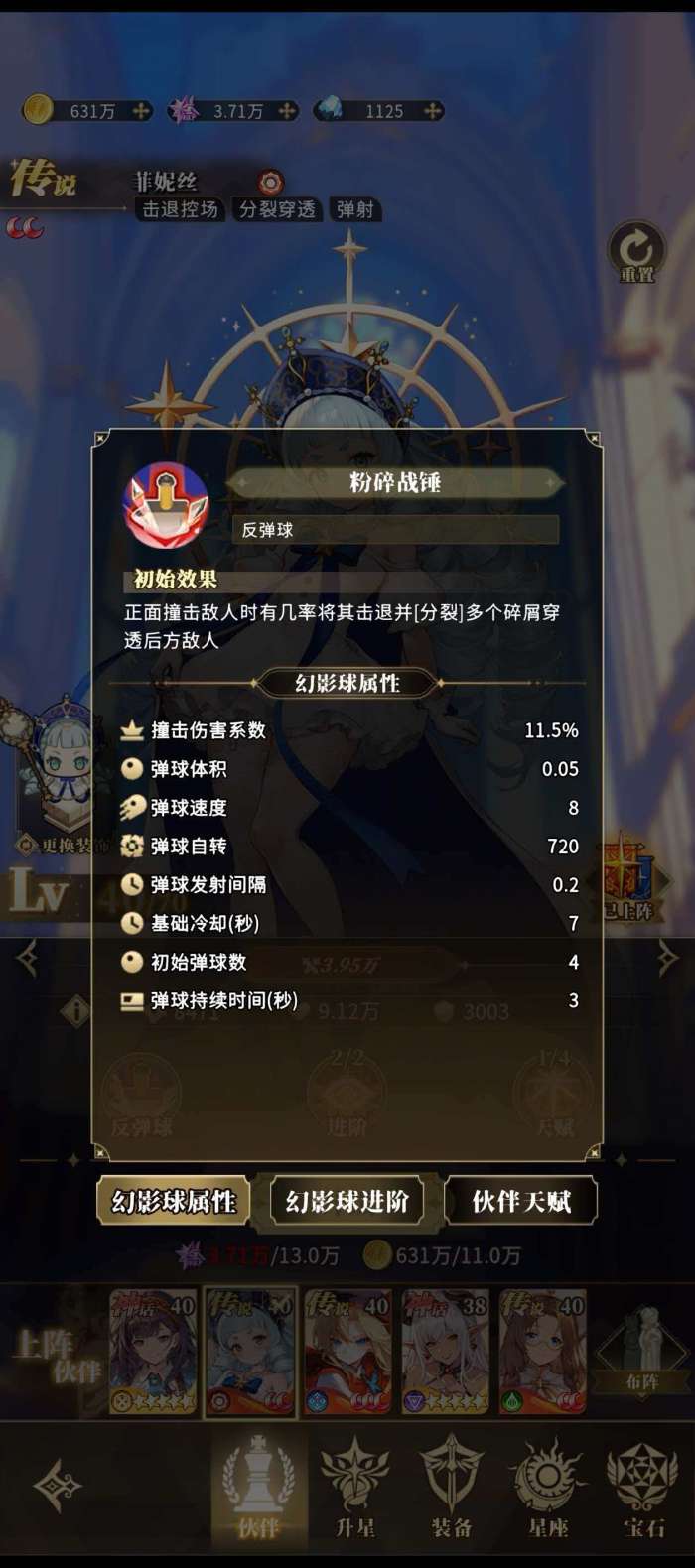 菲妮丝的幻影球名为粉碎战锤,当粉碎战锤正面对敌人进行撞击的时候,该技能就会有可能将敌人给击退并且球体分裂成多个碎屑穿透后面的敌人,进阶以后技能造成的伤害会提升60%,战锤在正面撞击敌人时还会附加上40%的冲击伤害。