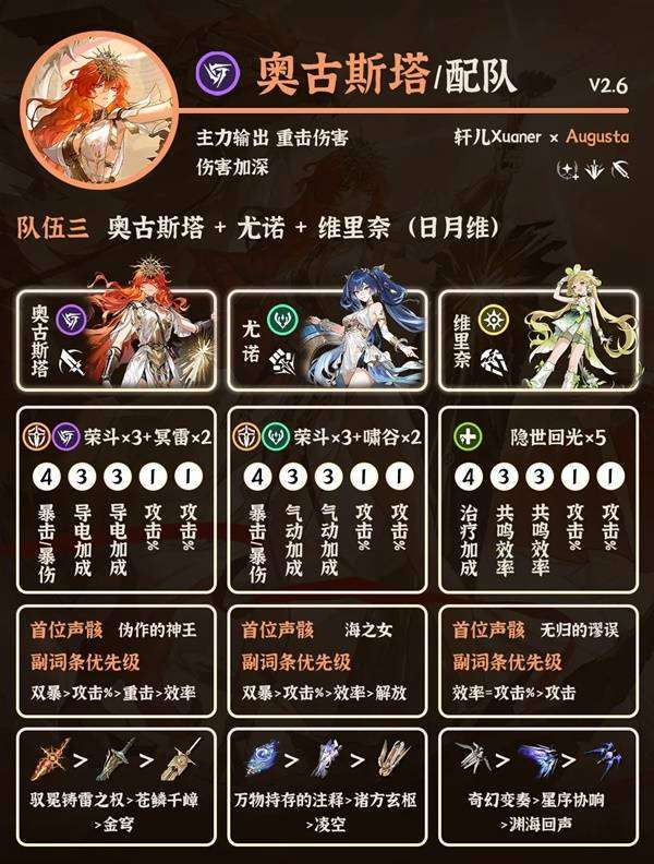奥古斯塔的最佳配队,尤诺提供高额的重击加成,且自身有一定的输出、护盾能力,护盾可以配合荣斗套的声骸效果。