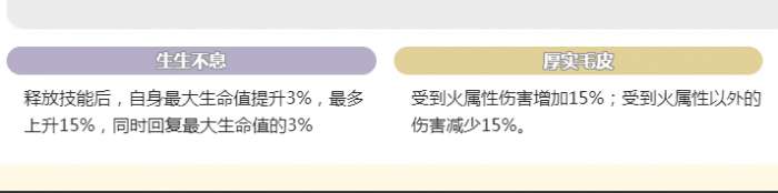 除了主动技能之外,被动技能也是比较有优势性的,例如生生不息,一看就很能打,在释放技能之后就可以有效提升3%的最大生命值,最多还可以叠加15%,续航能力可以直接拉满。厚实毛皮需要注意搭配,虽然受到火属性就会额外的增加15%的伤害。但除了火属性伤害之外,其他的全部都会减少15%的伤害。只要可以避开火系敌人,那生存的能力就可以直接飙升。亢奋这就是一个团队神技,一旦在放技能之后,队伍中的角色全部都会增加50%的伤害。唯一需要注意的是不能够叠加。