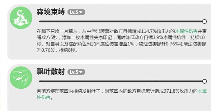 森境束缚在释放的时候就可以直接召唤草丛,藤蔓在缠绕之后就可以给敌方造成114.7%的攻击力。并且还可以束缚对方将近5秒的时间,同时会叠加一个木属性的失序印记,更绝的是就可以降低敌方3.9%的木属性抗性。不过与此同时也会给自己还有我方的队友增加1%的伤害加成,在8秒的时间内还是很有优势性的。飘叶散射这就是一个范围性的伤害利器会朝着前方矩形区域去持续的发射叶子。累击就可以直接打出371.8%的攻击力木属性伤害,在清理小怪或者是打群体boss时真的很好用。