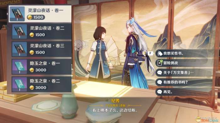 2、和万文集舍老板纪芳NPC对话后,选择我想买些书,前往购买页面;