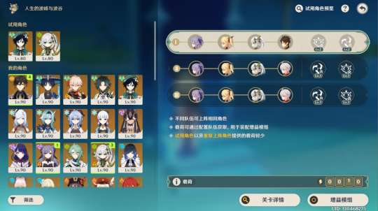 每次挑战活动中,会提供两个试用角色。队伍中使用自己的角色越多,角色等级越高,就能获得更多的"载荷",用于兑换并装配更高等级的"增益模组"。例如,如果全队都是90级角色,且有三个队伍拥有两个相同的角色,那么就可以使用这个共同的角色来充满所有队伍的"载荷",并获得更多的"增益模组"。所以,可以尝试使用相同队伍来完成挑战。