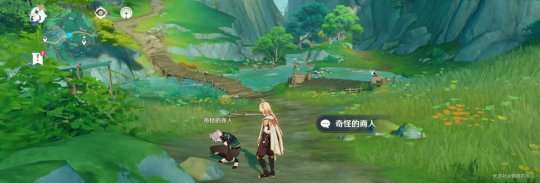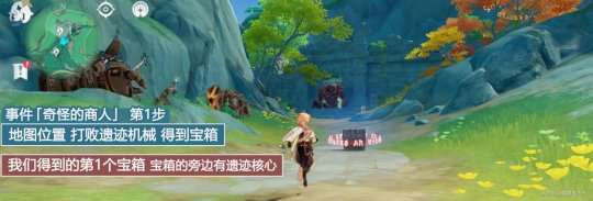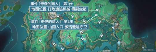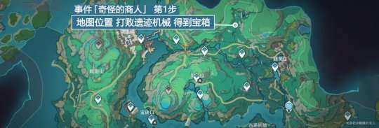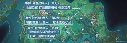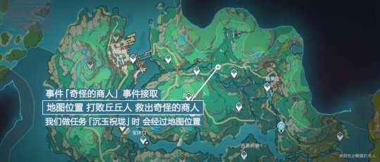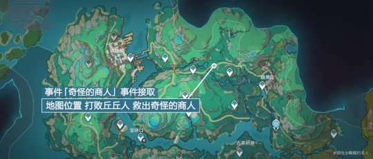 地图位置,我们会遇到两个丘丘人欺负一个奇怪的商人。