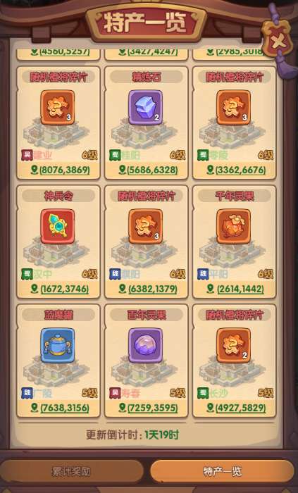 城池特产:每隔一小时给所占领阵营军功>0的成员累计一次特产,特产可以在城池特产-特产一览中查看,每两天会刷新一次。