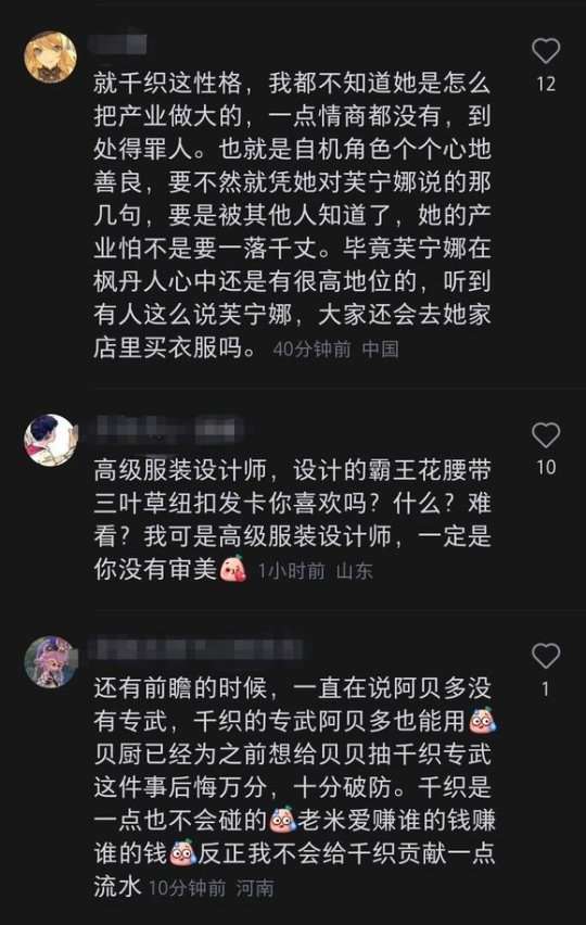 多数玩家都认为,千织这个性格实在是很难相信她可以把自己的服装产业做那么大,说话算是把人得罪了个遍,就凭她对于芙宁娜的那番言论,足以引起公愤了。