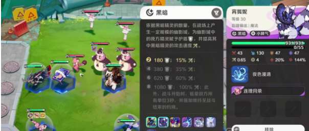 黑暗元理属于游戏中独特的属性类型,主要由能够克制光属性的精灵持有。其核心机制围绕“幽影域”展开:随着场上黑暗系精灵数量增加,将生成一个蓝紫色的六边形领域。该领域会随精灵数量增加而扩展,为范围内的所有黑暗系单位提供护盾加成并提升基础攻击倍率。