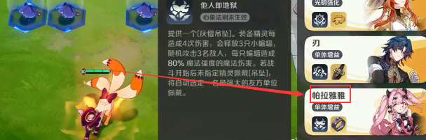 推荐以帕拉雅雅作为阵容核心辅助。她不仅能提供强力的单体强化,还能为队伍装备“厌憎吊坠”专属装备。装备此道具的小精灵每累计造成四次伤害,即可召唤三只蝙蝠随机攻击敌人,每只蝙蝠造成施法者80%基础法术强度的伤害,有效弥补黑暗体系在爆发输出上的不足。