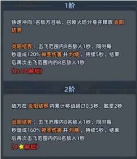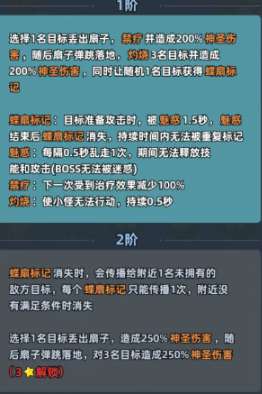 炽焰舞姬核心的战斗力主要是靠两个技能支撑,第1个阶段就可以打出不俗的效果,在提升等级之后,还能拥有翻倍的强度。一技能是核心的输出技能,在针对单个目标时,丢出扇子就可以造成200%的神圣伤害。扇子在掉落在地时,还能灼烧三个敌人,然后打出200%的神圣伤害,同时可以给随机一名敌人挂叠扇标记。这一个标记就堪称小怪克星,目标准备攻击时就会直接被魅惑1.5秒。而且禁疗还可以让敌人的治疗因此而失效,灼烧就可以直接定住小怪0.5秒,唯一遗憾的是这个技能对Boss没有效果。