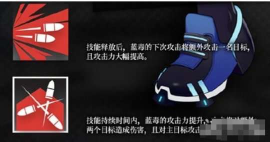 当蓝毒解锁二技能后,她可以在技能触发期间攻击额外的两个目标,同时对主要攻击目标进行两次攻击,即同时发起四次攻击。