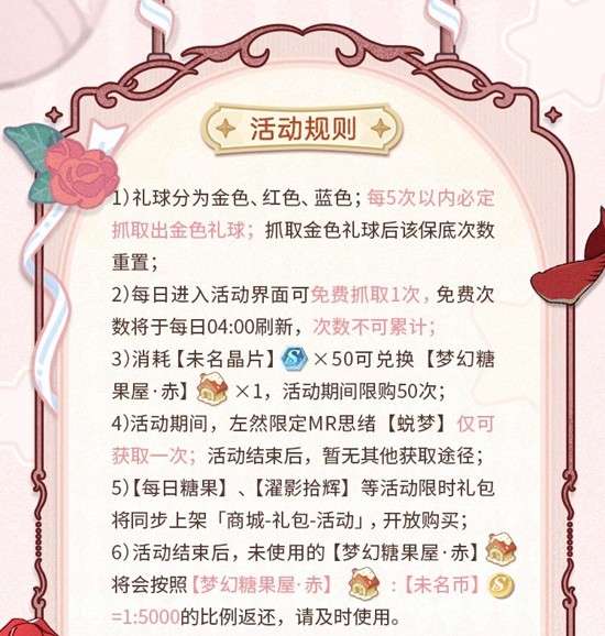 6)活动结束后,未使用的【梦幻糖果屋·赤】将会按照【梦幻糖果屋·赤】=1:5000的比例返还,请及时使用。