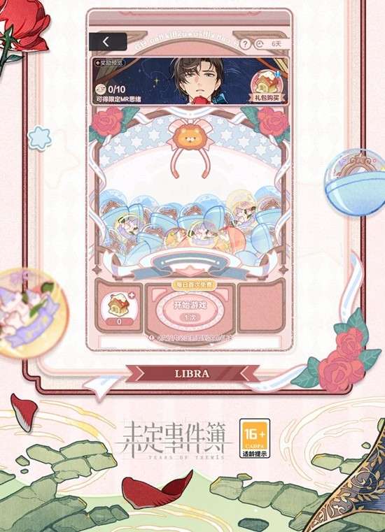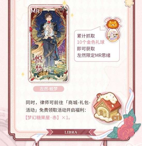 律师可通过消耗【未名晶片】获得的【梦幻糖果屋·赤】抓取各色礼球。每个礼球将在抓取后自动转化为【女神之泪】、【未名晶片】、升级素材道具等随机奖励;累计抓取10个金色礼球即可获取左然限定MR思绪【蜕梦】