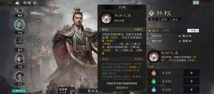 孙权是当前版本与徐庶协同性最高的辅助核心。其天赋可对敌方全体施加【制衡】(比拼时全四维降低),同时为己方全体赋予【统御】(全四维提升)。此增益直接放大徐庶及队友的比拼胜率;更关键的是,孙权在己方比拼成功时有概率追加【统御】,失败时亦能反制敌方造成伤害。实测数据显示,在孙权存在状态下,徐庶单次行动平均比拼胜出次数提升约42%。