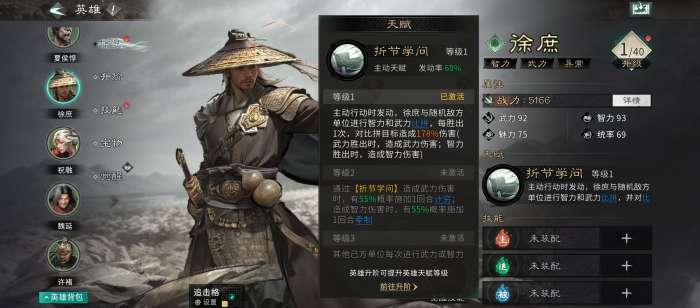 徐庶的主动天赋触发条件为自身行动时:随机选定一名敌方目标,同步进行武力与智力双属性比拼。每次比拼胜出,即对目标造成对应属性的高额伤害——武力胜出施加武力伤害并有概率附加【计穷】(禁用主动技能),智力胜出施加智力伤害并有概率附加【牵制】(禁用追击技能)。值得注意的是,徐庶初始武力与智力双值均处于中上水准,为比拼稳定性奠定基础。此外,当任意己方单位发动武力或智力比拼并成功后,徐庶可额外获得一次比拼机会,形成高频连动链。
