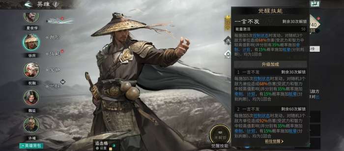 输出端配置上,徐庶可依队伍定位选择武力向或智力向技能:武力流推荐【单枪匹马】强化单体爆发;智力流则适配【兵不厌诈】【手到擒来】提升群体压制效率。第三位队友建议选择庞统(专注智力比拼,补足智力线控场)或吕玲绮(专注武力比拼,强化物理线压制),二者均可与徐庶形成双轨比拼体系,持续堆叠控制层数,加速觉醒技循环。