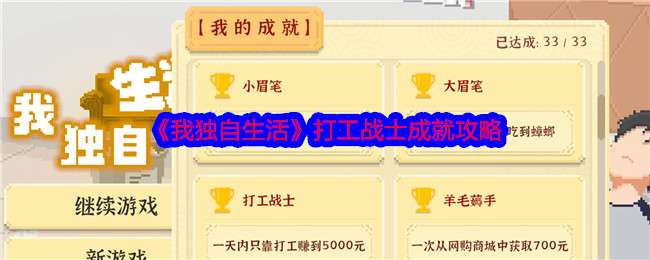 软件提交 专题合集 热门手游我独自生活趣味横生的像素风格游戏画面,不仅带来了视觉上的愉悦,更充满了温馨与欢笑,让每一次游戏都成为难忘的回忆。游戏中有很多的成就,其中打工战士成就怎么达成呢?下面是pk游戏网小编给大家带来的《我独自生活》打工战士成就攻略,感兴趣的小伙伴们一起来看看吧。