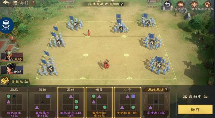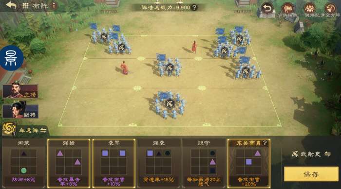 阵型可优先选择励军/强掳、倾覆、屯守,如果有东吴帝胄羁绊,则选择东吴帝胄、倾覆、励军。