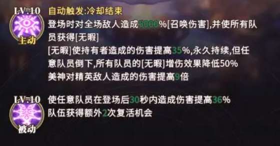 需注意:当任意我方角色倒地时,全队「无暇」增伤效果将衰减至原值的50%;同时,美神对精英单位的伤害倍率提升至9倍;其被动技能可在任一队友登场后的30秒内,为其提供36%的伤害加成。