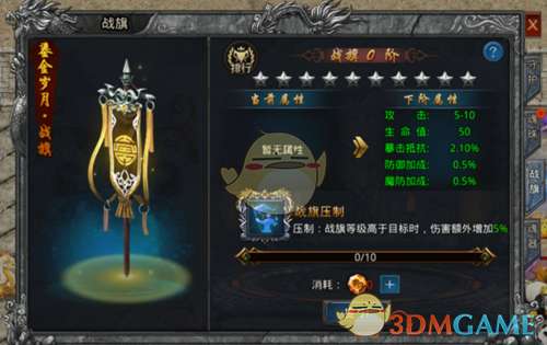 3、战旗等级全服第1,第2第3和4-10名的玩家可额外获得5%,4%,3%,1%的额外压制伤害