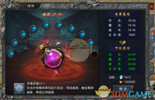 升级魂珠等级可以提升的效果有:攻击,魔法,道术和生命值。需要消耗魂珠精髓和元宝。
