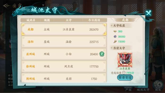 2.城池太守每日可获得收益,其中主城、皇城、州城收益相同,关口太守的收益低一档。