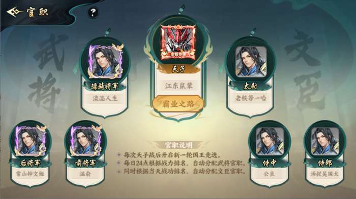4.文臣:根据当日结算的战功排名,自动分配文臣官职。