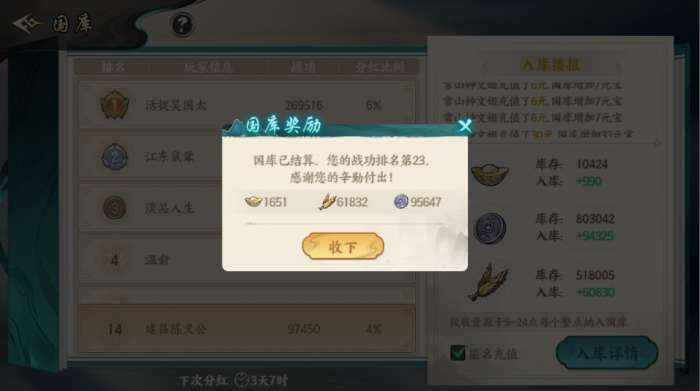3.每四天进行一次国库分红结算,根据本国成员的战功排名,邮件发放分红奖励。