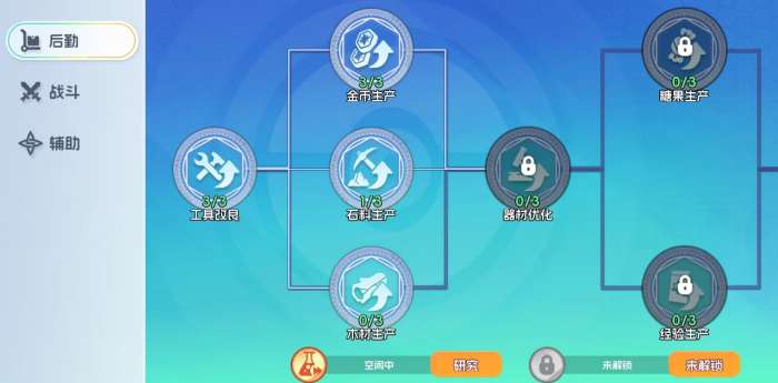 玩家需要在基地里使用建造功能将研究所造好后,才能开启研究所玩法。它是一个可升级的建筑,里边有后勤、战斗和辅助三大类别的科研项目可供玩家们去研究,其中后勤里的科研项目主要以提高基地的发展效率和资源产出收益为主,战斗里则是与野外玩法相关的科研项目,可提升宝可梦部队的属性和加快它们采集资源的速度,辅助类别的科研项目则能提升宝可梦各项能力,让宝可梦们在战斗中获得更多的强化加成,变得更加厉害。