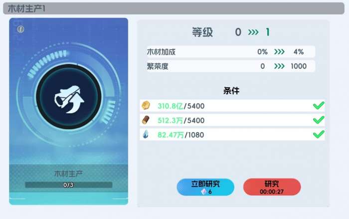 每一类别的研究都采用了逐级解锁的模式,只要将项目前边的所有科研项目全部研究完,才能解锁该科研的研究,每次进行研究时,还会根据研究项目的不同,需消耗掉不同数量的金币、石料、木材等资源,完成后不光能获得科研所提供的强化效果,还能进一步提高基地的繁荣度。初始时玩家只能拥有一个研究队列,即每次只能研究一项科技,若要解锁第二个研究队列,需购买研究队列礼包。此外,玩家们若是为研究所升级,还可提高研究加成,这一效果能直接强化研究所里全部科研项目的加成效果,令科研变得更有性价比。
