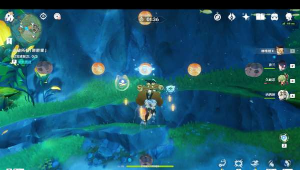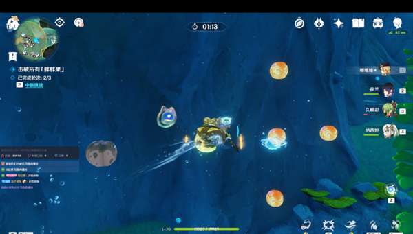 今天的线索挑战有两种类型:一种触碰线索光球后,需要使用炸弹水母的能力,将黄色的果实一次性炸没。瞄准正中间的发射炸弹,随后再次引爆炸弹就可以完成挑战。