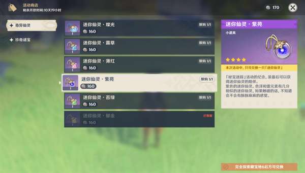 其中迷你仙灵只能兑换一个,需要完成第六天的任务才可以兑换。参加过上次活动的旅行者不能兑换同样的仙灵。