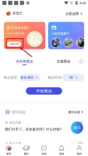 1、同样是首页的本命盘界面,点击白色的“切换档案”。