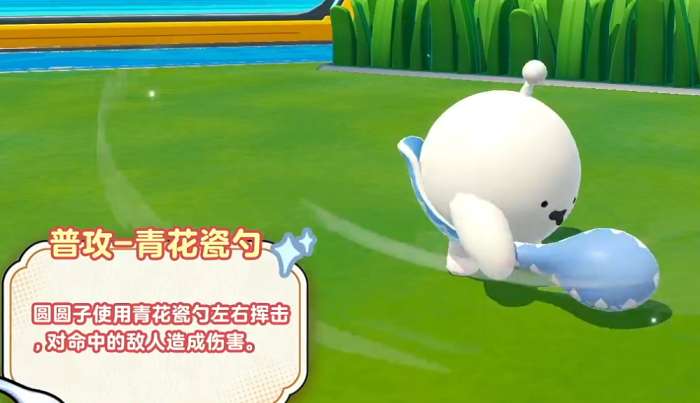 普攻是青花瓷勺,左右挥击对附近敌人造成伤害。没什么特别复杂的操作,就是基础的近身攻击,适合在技能冷却的时候补刀用。一技能叫糯糯敲击。圆圆子会鼓起肚子,然后用勺子敲自己的肚子,把糯米浆震散出去,对附近的敌人造成伤害和减速。这个技能主要用来控制对方的移动,对手被减速之后走不快,后续连招就更容易打到了。近身战的时候先放这个,对方跑不掉,后续输出更稳。
