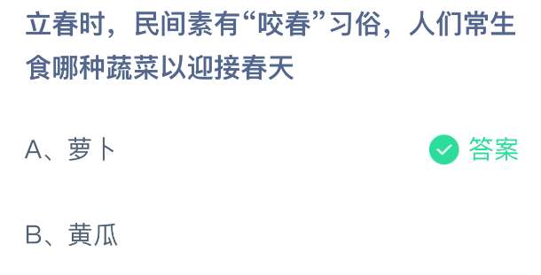 以上就是立春时,民间素有“咬春”习俗,人们常生食哪种蔬菜以迎接春天?支付宝蚂蚁庄园2026年2月4日答案最新,更多相关攻略,请关注pk游戏网更新!