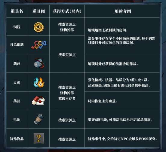 软件提交 专题合集 热门手游无限轮回中,事件道具可通过搜索资源点、怪物掉落或救援幸存者获取。锎钱和钥匙用于解锁封锁房间;葫芦可召唤法器助战;灵魂用于强化枪械法器;药品恢复血量;集齐6颗电池可开启紧急撤离;特殊物品交给NPC可触发BOSS现身。