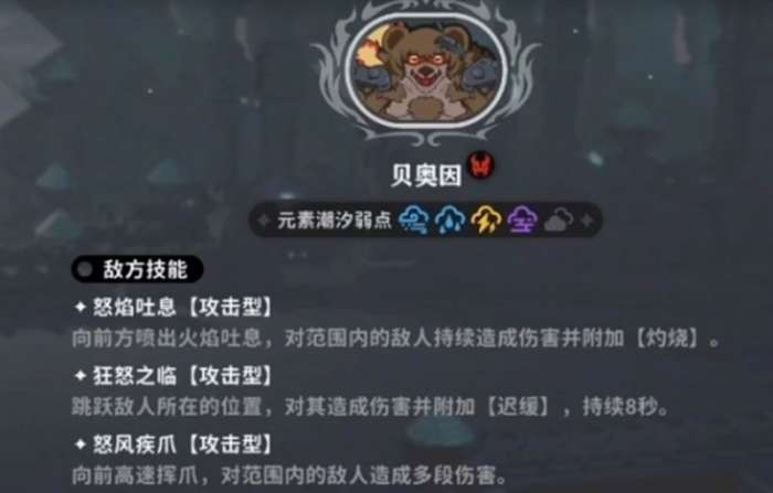 贝奥因的第一个技能是怒焰吐息攻击,这个技能会向前方吐出火焰,对范围内的敌人造成火焰伤害。当boss释放这个技能时,地面会出现火焰圈提示技能范围,玩家需要及时观察地面变化并躲避火焰攻击。除了怒焰吐息攻击外,贝奥因还拥有狂怒之临攻击技能,这个技能通过跳跃到达指定位置,对敌人造成伤害并附带持续8秒的减速效果。如果玩家吃到减速效果,需要特别注意血条情况并及时回血保持战斗力。