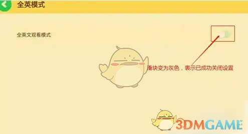 4、打开“全英模式”设置界面,点击“全英文观看模式”后方滑块处的圆形按钮;