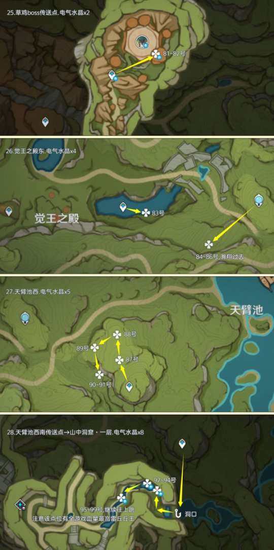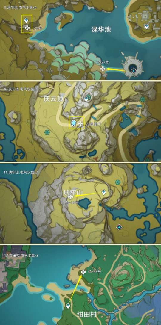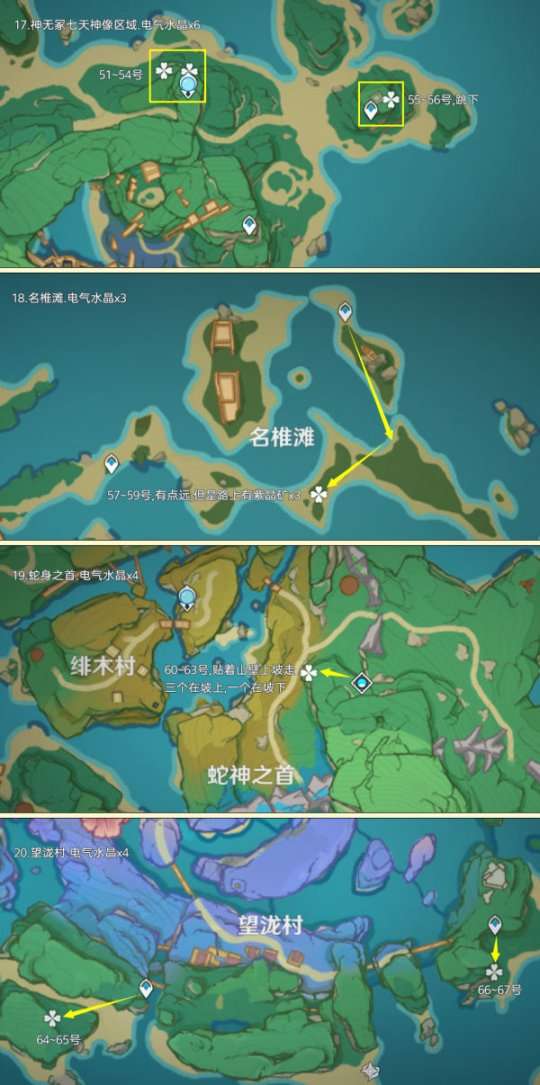 电气水晶点位广泛的分布在提瓦特地区,其中可重复采集数量为160个;超高效率点位有枫丹雷麒麟boss点,有23个;制作路线时尽量遵循从上往下游,视野高好看清,方便旅行者探索。