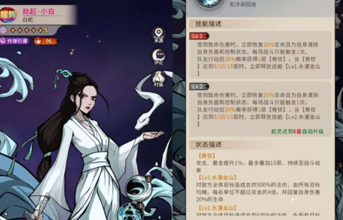 第二个被动渡劫之志,才是白蛇真正的核心优势。首先能保命,受到致命伤害不会直接死,还能回血清负面状态。这点大大提升了生存能力和反打空间,就算被集火也有翻盘机会。其次就是输出机制了,队友每次行动后,有40%几率,给白蛇叠一层骨钗。叠到5层10层15层的时候,就能释放水漫金山打全体aoe伤害。15层的伤害倍率,有700%法伤,配合队友高频率行动,能快速叠层释放多次aoe。