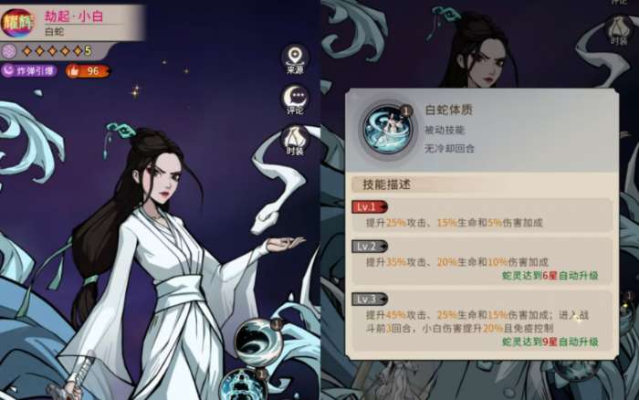 被动技能白蛇体质,有个很实用的免控效果。9星以后,前3回合可以免疫控制,这点在pvp和高难度副本里帮助很大。很多队伍都是靠前期控制建立优势,白蛜有了这个免控就能稳稳站住前期,不会被对面直接控死。虽然只有前3回合,但通常前3回合才是最重要的时候。