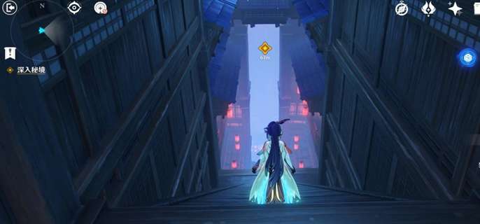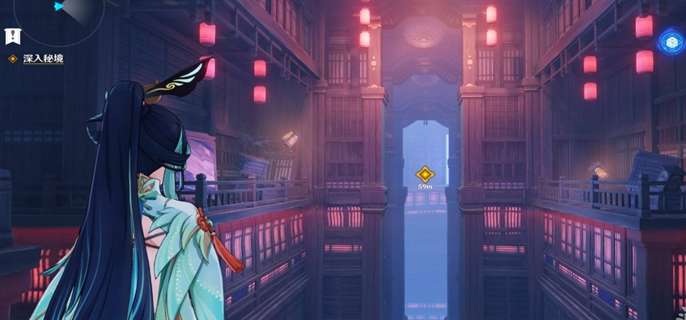 进入秘境后继续触发剧情。秘境中,两侧的房顶有空气墙,直接沿着楼梯往下走,下方也会出现空气墙,可以直接踩着空气前进。