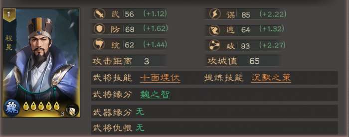 程昱为魏阵营谋略控制型武将,核心依靠自带主动技能「十面埋伏」对敌军群体施加混乱、谋略伤害与攻击距离降低效果,谋、政属性表现优异,推荐站位为大营,是魏阵营体系中重要的控场与谋略输出点。